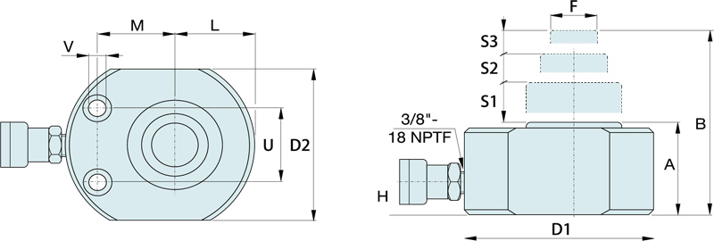 规格型号 本体高度 A (mm) 最大行程   (mm) 工作能力 最大行程 (kN) 第1级 第2级 第3级 柱塞直径 F (mm) 重量   (kg)