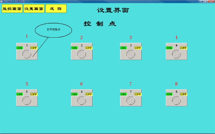 2.贴合:进入【设置】画面,先选择要顶升的点将其打开,然后进入【监控】画面,设定好各点的贴合压力。打开总停按钮,将单动锁开关拨至右边位置,然后按下【贴合】按钮,各顶开始顶升,当【贴合】灯常亮时,表示【贴合】动作结束,此时可操作同步顶升。贴合过程中如需停止操作,按下【停止】按钮即可。如图所示: