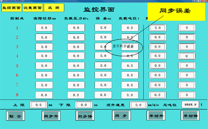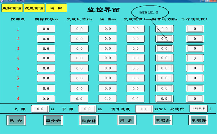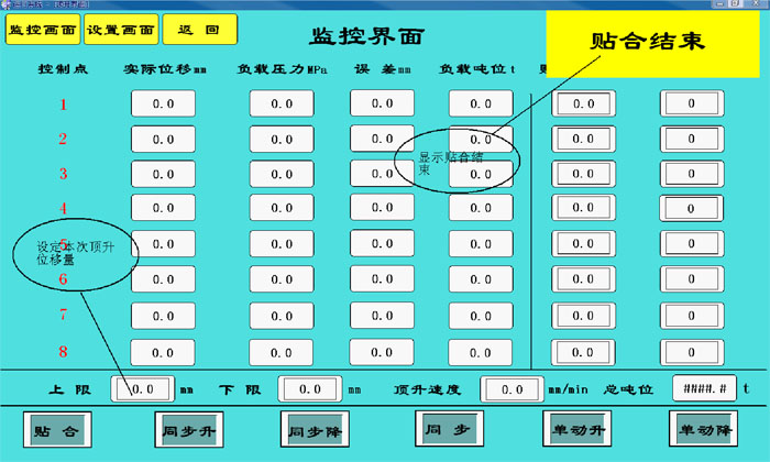 3.同步顶升:当【贴合】灯常亮后,界面显示(贴合结束)。进入【监控】画面,设置要顶升的位移量上限,然后按下【上升】按钮即可。各点千斤顶开始运动,当各点千斤顶的位移达到需要的顶升位移量时,即按下【停止】按钮即可。如图所示:
