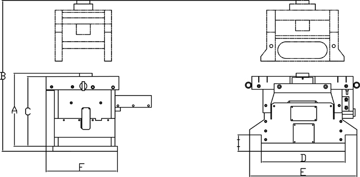 规格型号 最大侧载   (m) 每基础单元 的起重能力 (T) 顶升 行程 (mm) 旋转鞍座可调行程 (mm) 最大允许 单台油流量 (l/min) 前进   (cm³) 缩回   (cm³) 端块 重量 (kg) 底座重量   (kg) 垫块 重量 (kg)