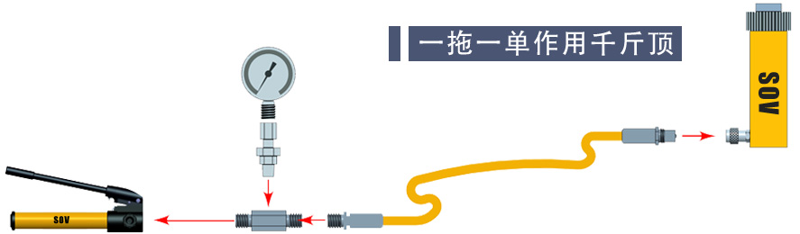 对于单台液压千斤顶使用的,我们可以选择满足其缸体容积的液压手动泵。对应的配置清单:手动泵1台,单作用液压千斤顶1台,高压接头2副(公接头、母接头),液压油管1根,压力表1只。