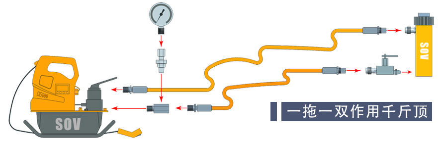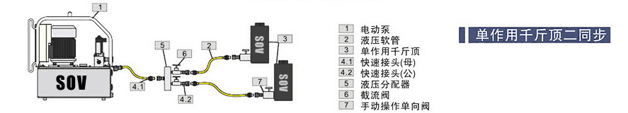 为使2台单作用液压千斤顶同时工作,首先确保千斤顶为同型号,接下来我们选择满足2台缸体容积的液压电动泵。对应的配置清单:电动泵1台,单作用液压千斤顶2台,高压接头6副(公接头、母接头),液压油管3根,液压分配阀1只、截流阀2只(可选)、单向阀2只(可选)。