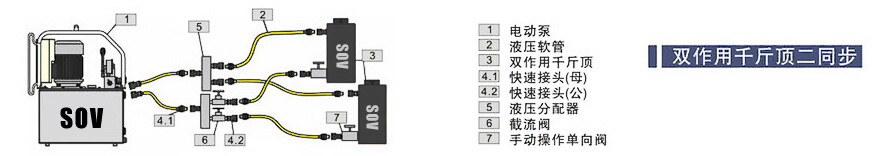 为使2台双作用液压千斤顶同时工作,首先确保千斤顶为同型号,接下来我们选择满足2台缸体容积的液压电动泵。对应的配置清单:电动泵1台,双作用液压千斤顶2台,高压接头12副(公接头、母接头),液压油管6根,液压分配阀2只、截流阀2只(可选)、单向阀2只(可选)。