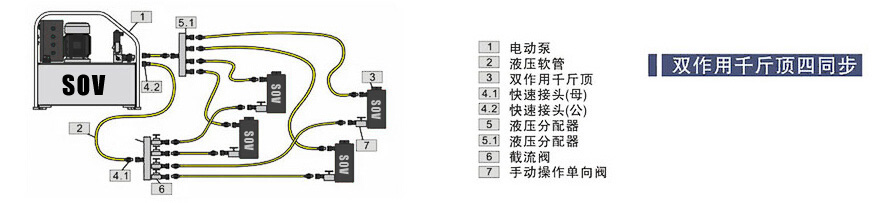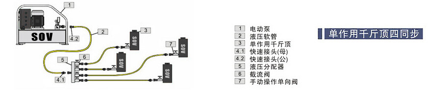 为使4台单作用液压千斤顶同时工作,首先确保千斤顶为同型号,接下来我们选择满足4台缸体容积的液压电动泵。对应的配置清单:电动泵1台,单作用液压千斤顶4台,高压接头10副(公接头、母接头),液压油管5根,液压分配阀1只、截流阀4只(可选)、单向阀4只(可选)。